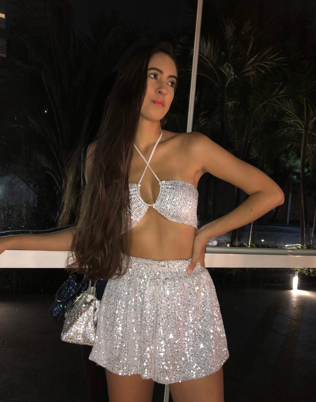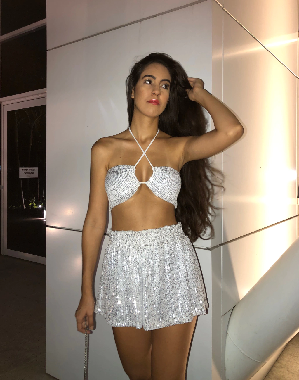 Para quem ama top estilo biquíni, que ama um efeito UP no busto e para as garotas que gostam de peças com várias amarrações... o top Jade em mini paetê prata é o IDEAL!